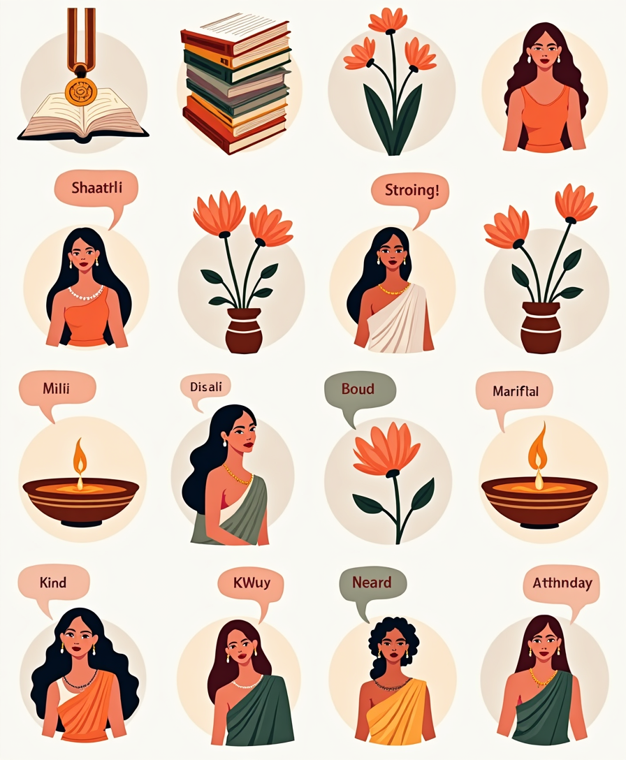 ? Cultural Icons – Tea, thali, sitar, tabla, rangoli, mehendi patterns, and village scenes