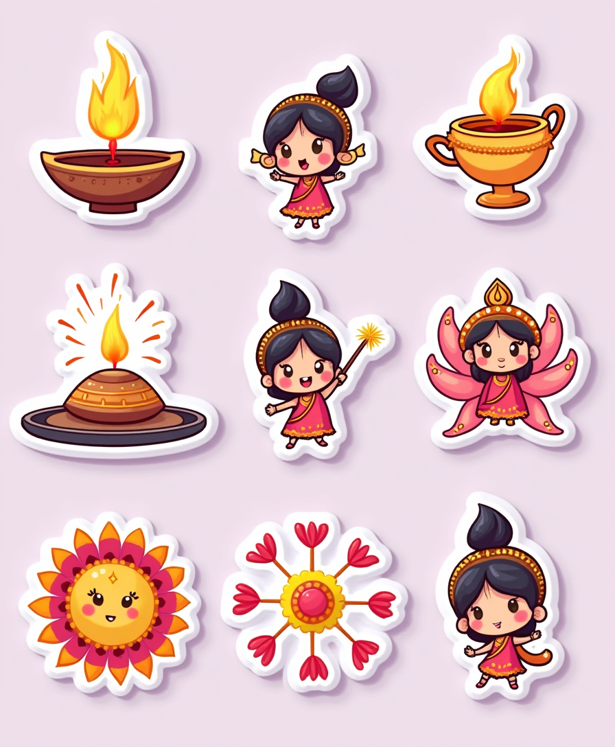 Bring home the joy and brightness of Diwali with our Diwali Festival Sticker Pack – a vibrant set of premium waterproof vinyl stickers inspired by India’s most cherished celebration. Each design captures the essence of the festival, from glowing diyas and colorful rangolis to sparkling fireworks and delicious sweets.