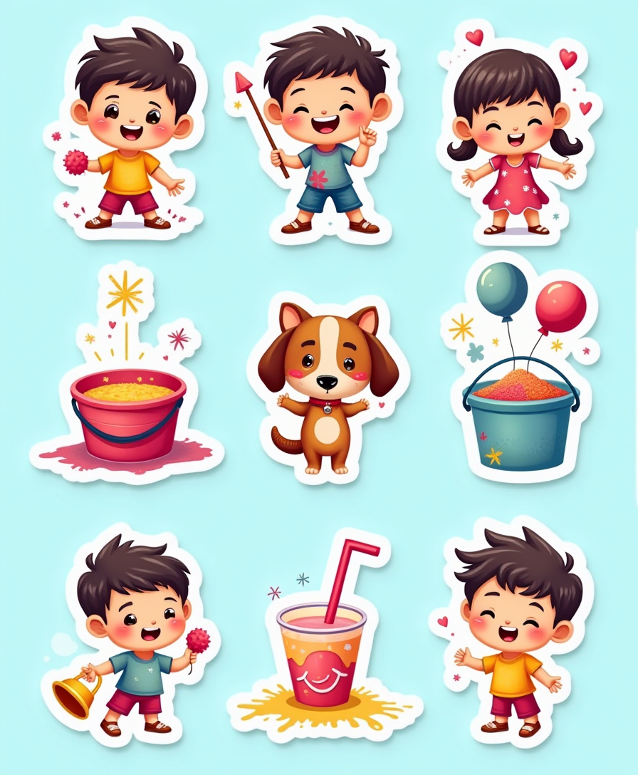 Vibrant Holi-themed stickers with splashes of color, pichkaris, gulaal plates, and festive patterns. Perfect for parties, greetings, and decor.