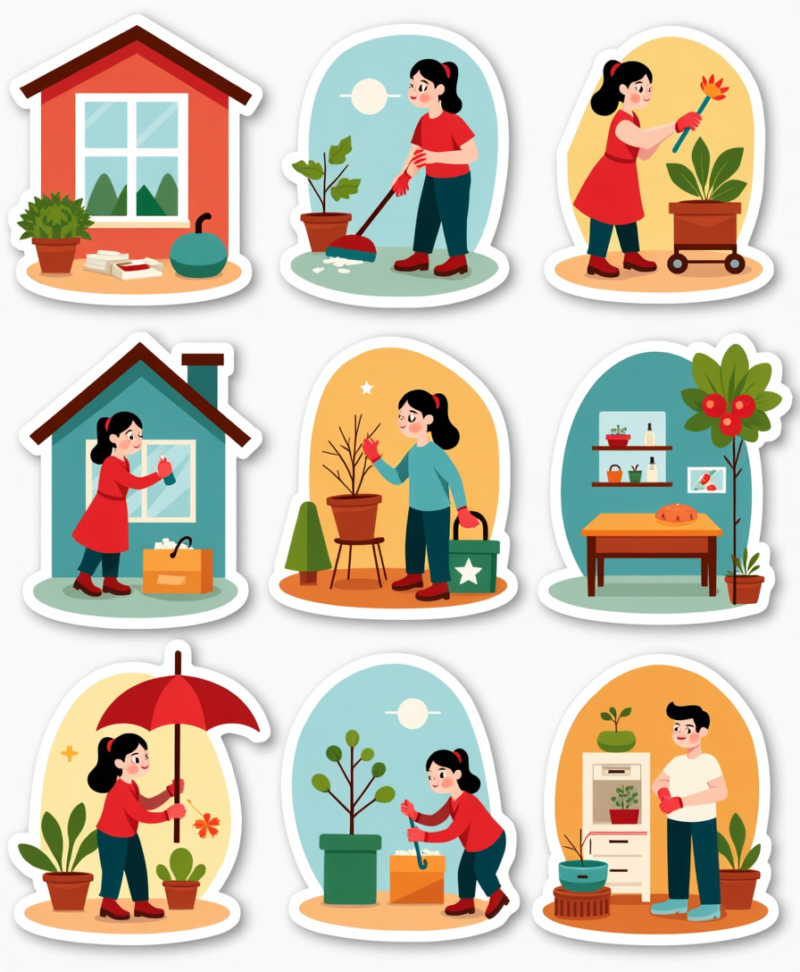 Practical and fun household & chores stickers — from cleaning icons to laundry day reminders. Perfect for planners, journals, or simply keeping your daily home tasks colorful and organized.