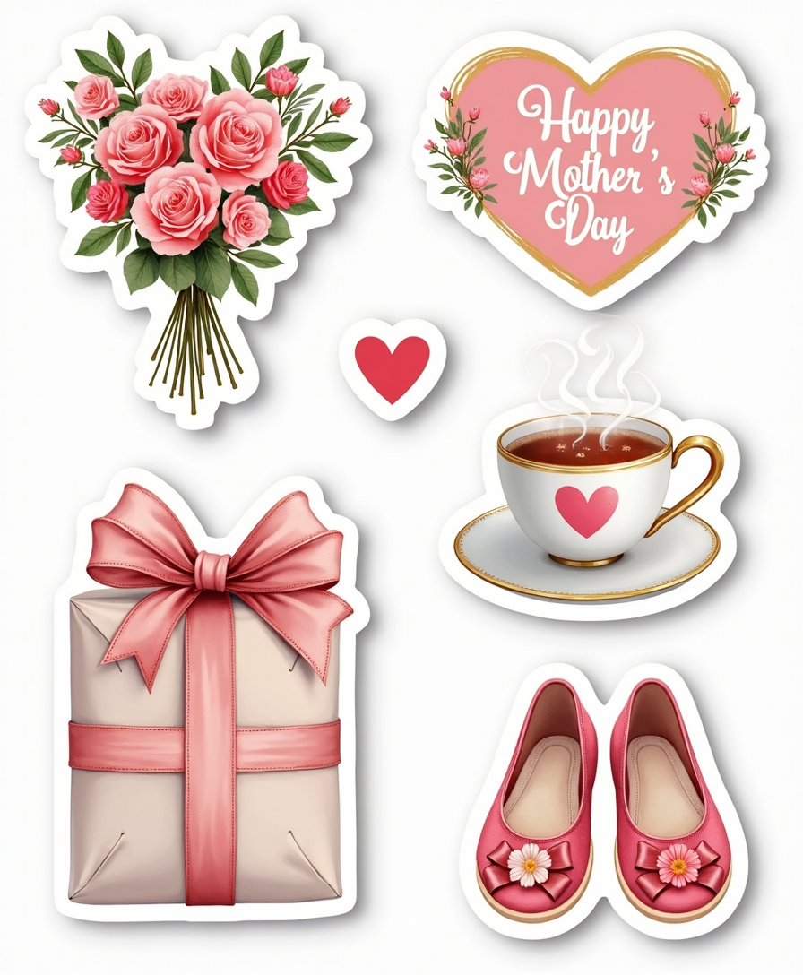 A charming collection of stickers featuring loving messages, flowers, hearts, and family-themed designs perfect for celebrating Mother’s Day and Father’s Day.