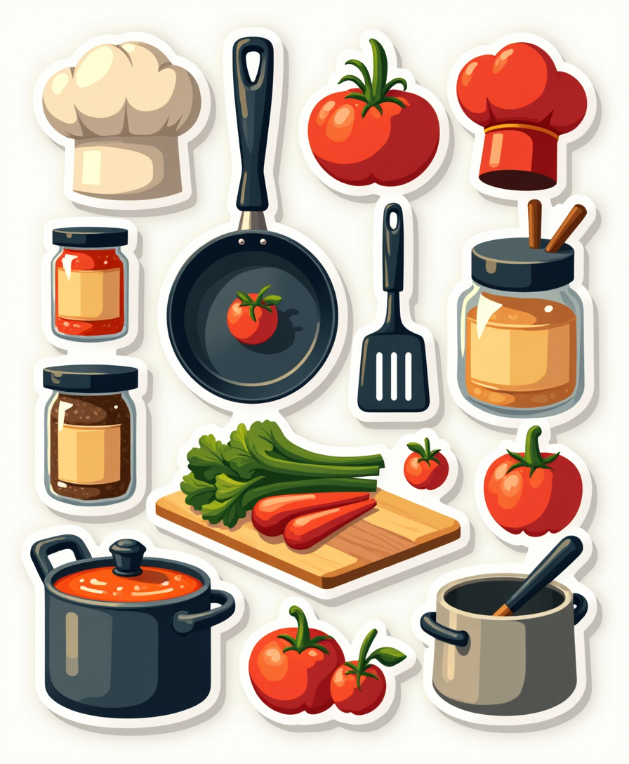 • ? Cooking: pans, spatulas, chef hats, recipe books