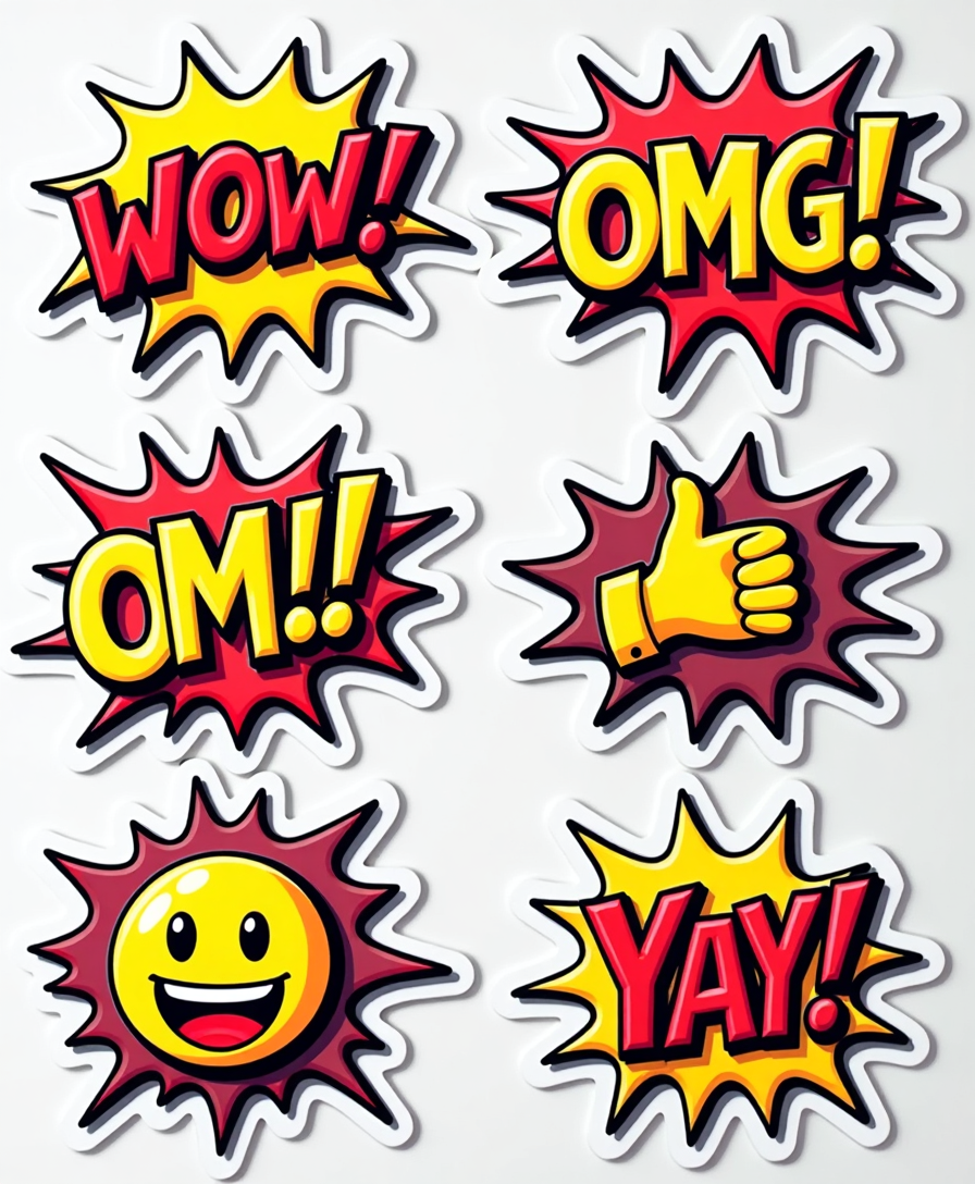 This vibrant set includes classic reactions like thumbs up, eye roll, facepalm, clapping hands, and shocked face – all in premium vinyl for long-lasting color and durability.