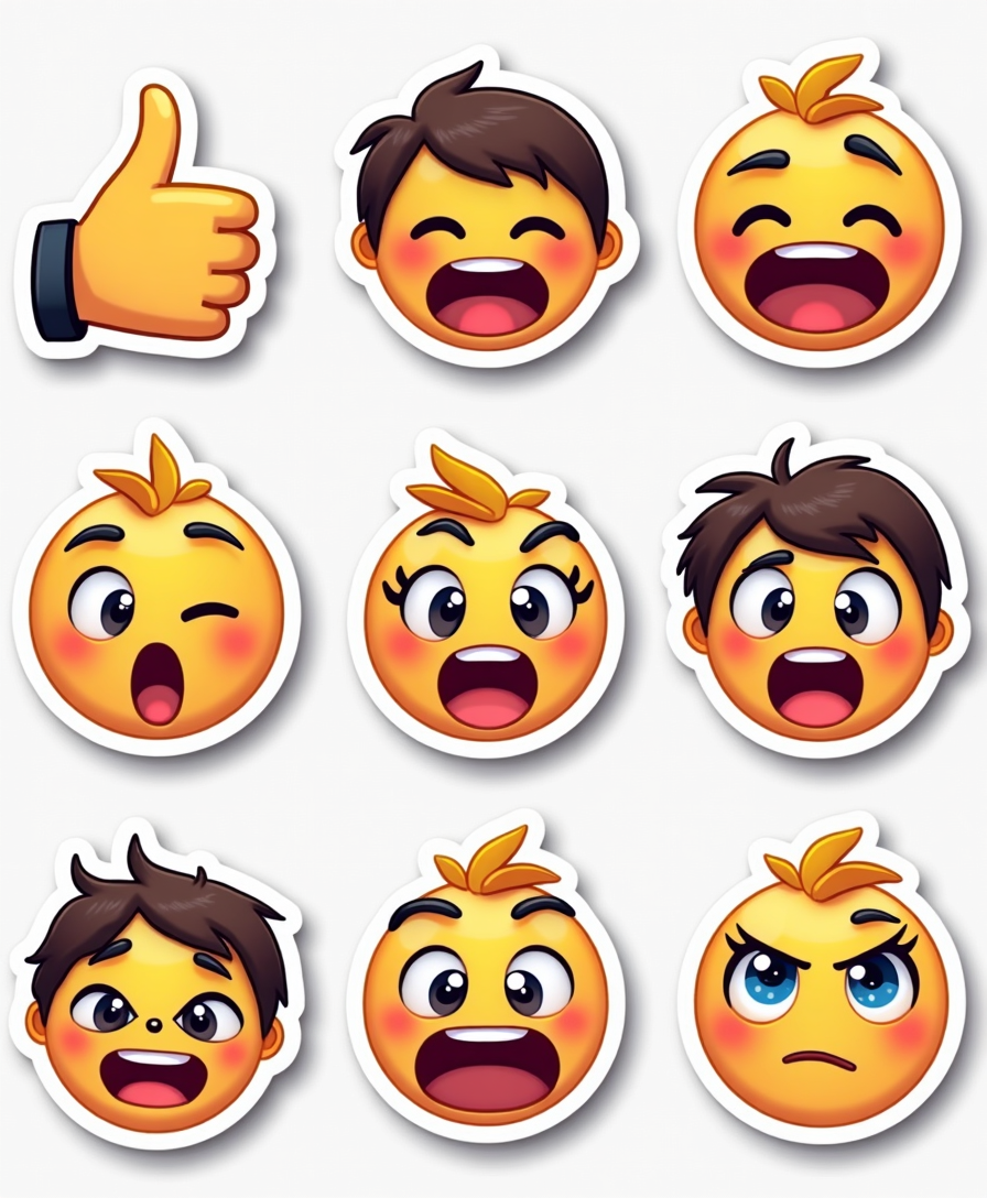 This vibrant set includes classic reactions like thumbs up, eye roll, facepalm, clapping hands, and shocked face – all in premium vinyl for long-lasting color and durability.