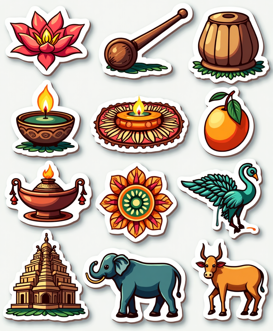 ?️ Symbols: Kolam, tribal motifs, temple bells, conch shells, peacocks, elephants, lotus, and cultural emblems.