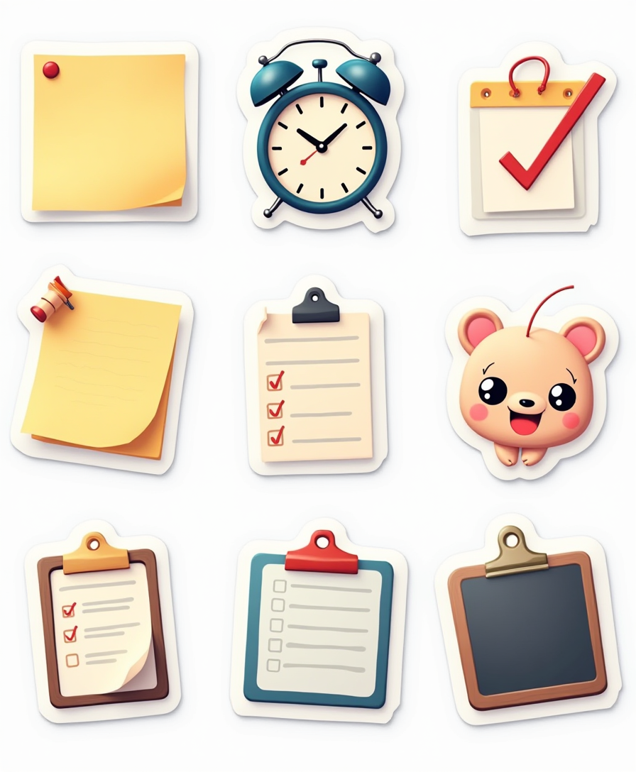 Stay on top of your tasks with our Reminder & To-Do Sticker Pack – featuring sticky notes, alarms, checklists, and bold alerts that keep your schedule in check. Perfect for planners, journals, and workspaces.