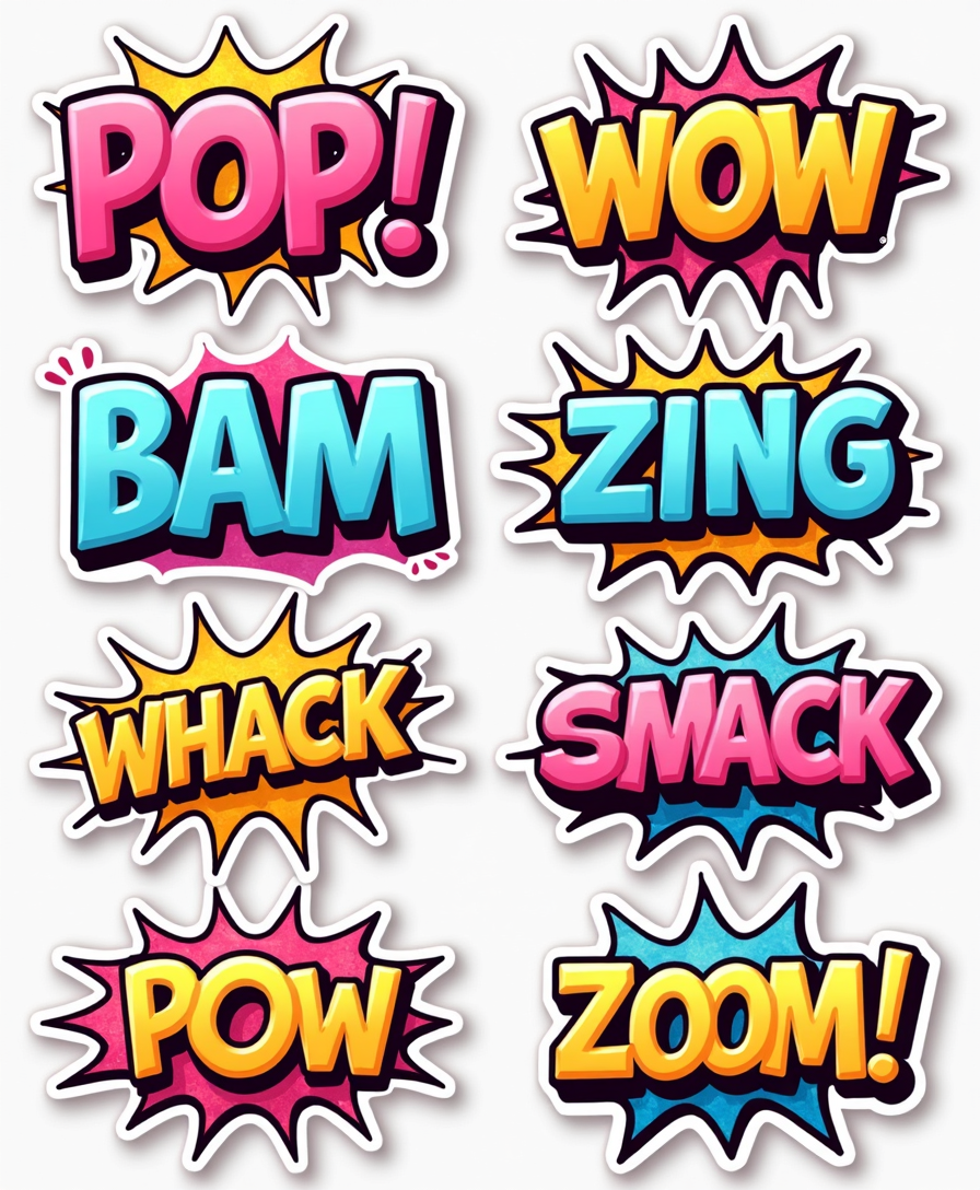 ? Unique Designs: Fun onomatopoeia words like Boom, Pow, Zap, Bang, Whoosh, and more.
