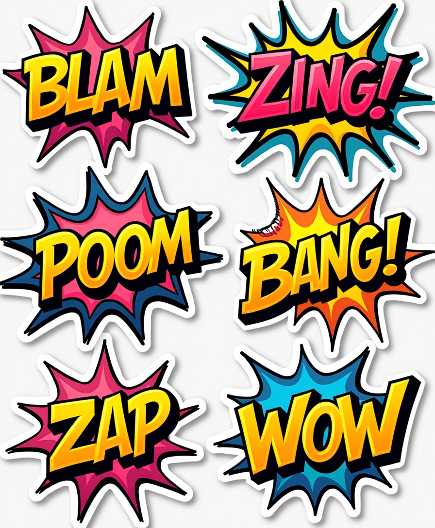? Unique Designs: Fun onomatopoeia words like Boom, Pow, Zap, Bang, Whoosh, and more.