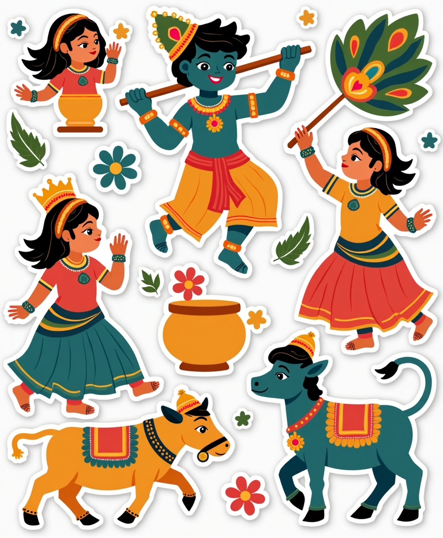 Celebrate the spirit of Krishna Janmashtami with this beautifully illustrated sticker card. Featuring Baby Krishna, Dahi Handi, peacock feathers, and festive elements, this kiss-cut sticker sheet is perfect for decorating gifts, scrapbooks, journals, or DIY crafts.