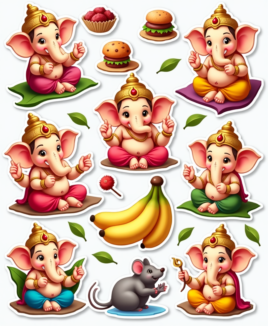 Celebrate Ganesh Chaturthi with this festive sticker sheet featuring artistic depictions of Lord Ganesha, modaks, and vibrant Indian elements. Perfect for journaling, gift decor, scrapbooks, or festive crafts.