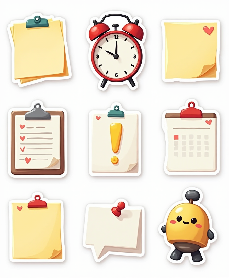Stay on top of your tasks with our Reminder & To-Do Sticker Pack – featuring sticky notes, alarms, checklists, and bold alerts that keep your schedule in check. Perfect for planners, journals, and workspaces.