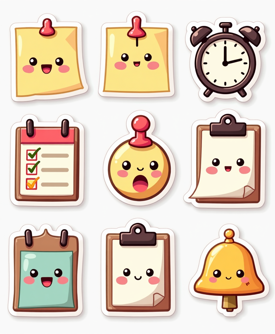 Stay on top of your tasks with our Reminder & To-Do Sticker Pack – featuring sticky notes, alarms, checklists, and bold alerts that keep your schedule in check. Perfect for planners, journals, and workspaces.