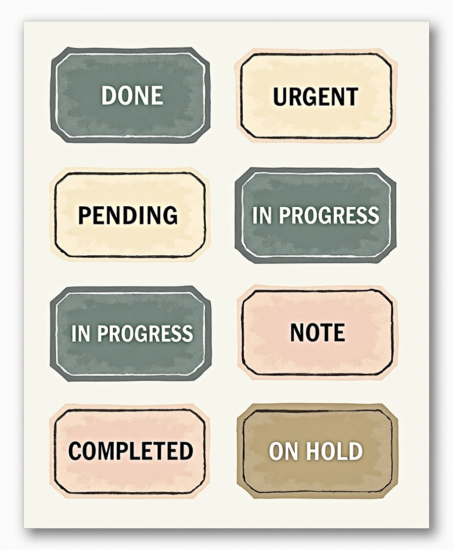 Mark your progress with the Status & Priority Sticker Pack – bold, easy-to-read labels like “DONE,” “URGENT,” and “IN PROGRESS” to keep your projects and plans organized.
