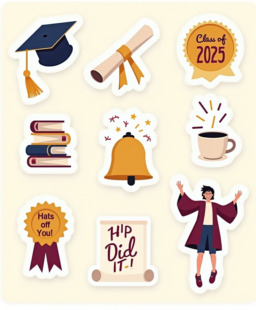 Stylish and heartfelt stickers capturing graduation pride, school memories, and farewell moments — perfect for cards, scrapbooks, or keepsakes.