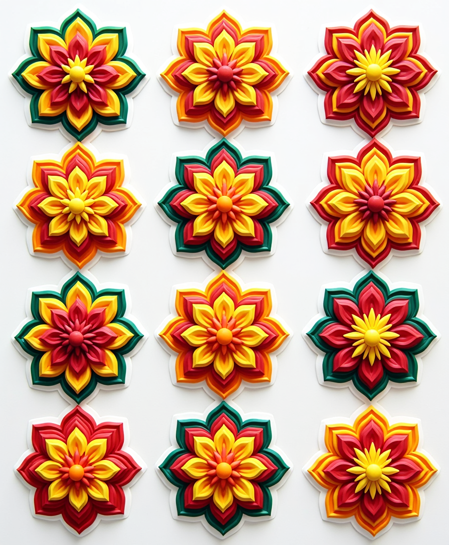 A vibrant collection of mandala and rangoli-inspired stickers, perfect for decorating journals, planners, scrapbooks, and festive crafts.