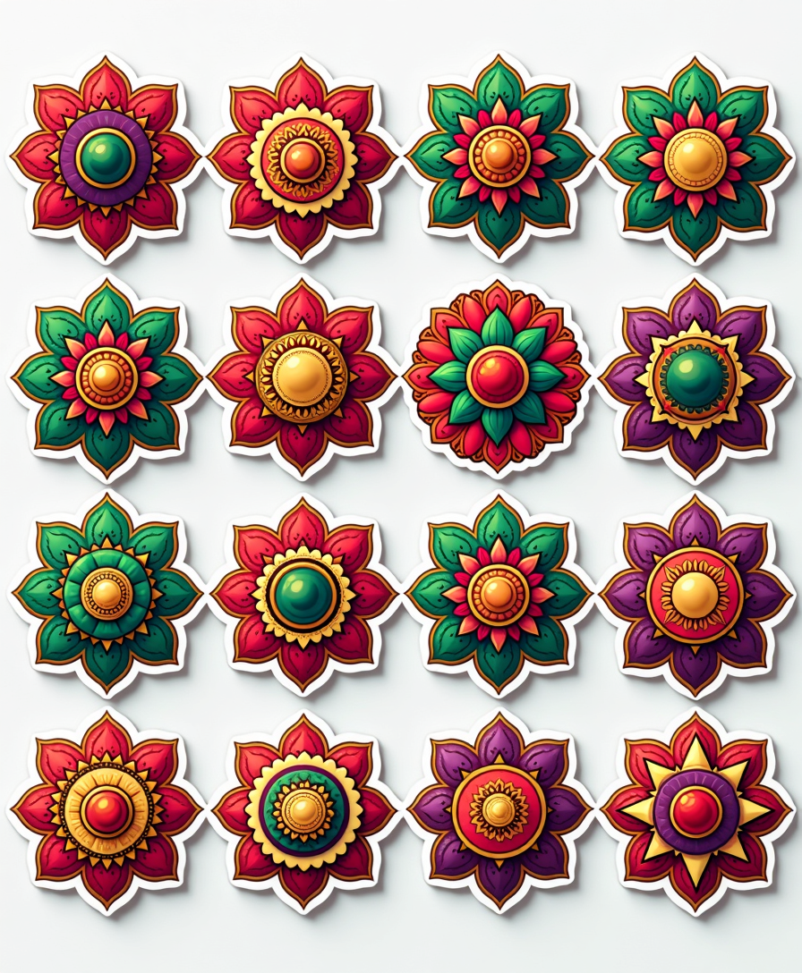 A vibrant collection of mandala and rangoli-inspired stickers, perfect for decorating journals, planners, scrapbooks, and festive crafts.