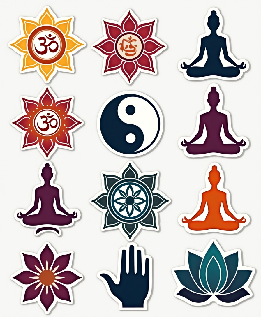 A mindful collection of yoga poses, mudras, chakras, and sacred symbols designed as vibrant stickers to inspire inner peace and balance.