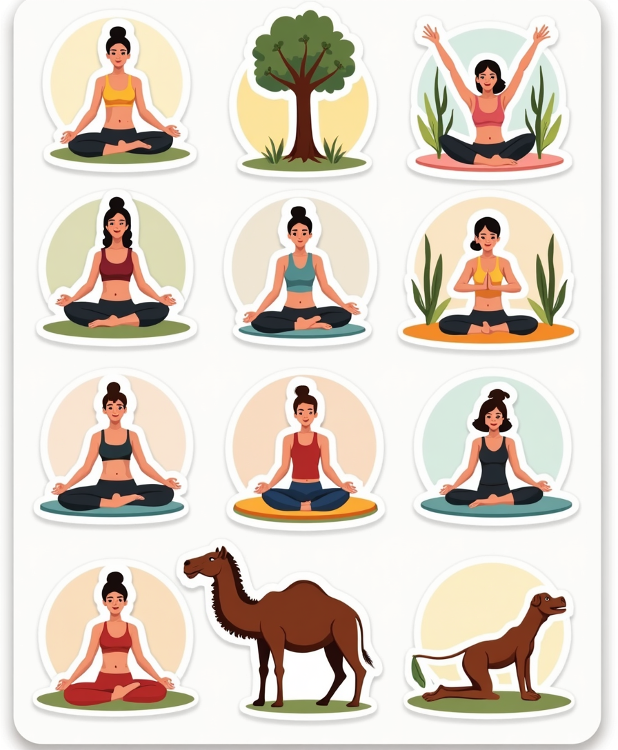 A mindful collection of yoga poses, mudras, chakras, and sacred symbols designed as vibrant stickers to inspire inner peace and balance.