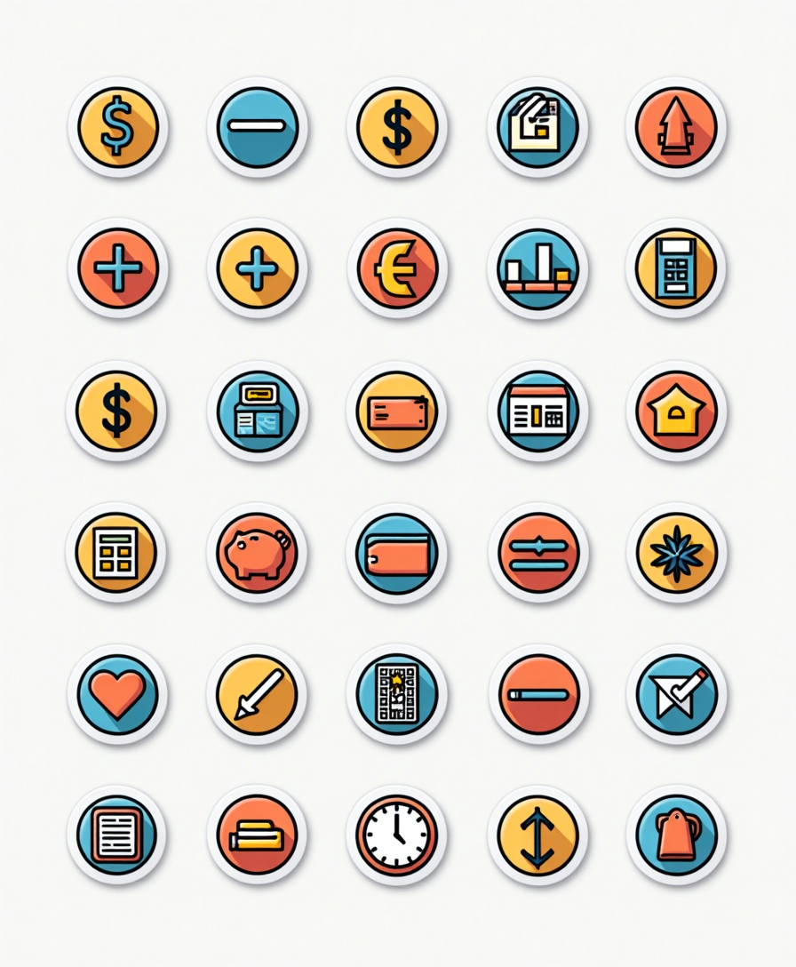 Functional finance stickers for planners: bills, paydays, savings goals, expense icons, no-spend challenges, and more—clean layouts, bold lines, cut-friendly borders.