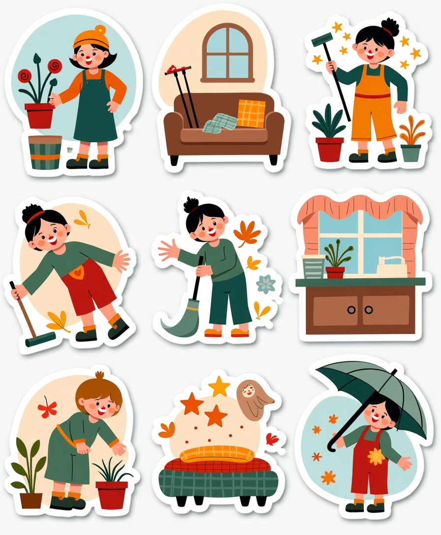 Practical and fun household & chores stickers — from cleaning icons to laundry day reminders. Perfect for planners, journals, or simply keeping your daily home tasks colorful and organized.